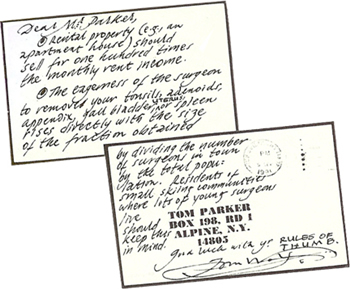 Stewart Brand published the first batch of rules in CoEvolution Quarterly magazine with a call for further entries. CoEvolution readers sent postcards and letters from as far away as Alaska, Japan, and Australia. This was all before the Internet. In those days, rules arrived by snail mail. Some were written on fancy letterheads. Others arrived on napkins, stolen office stationery, and airline barf bags. Many people included their ideas about the phrase "rules of thumb." Some suggested that "rule of thumb" refers to the relationship between the human thumb and the length of one inch. Others thought the term came from an old English law that said a man could legally beat his wife and children with a stick no thicker than his thumb.